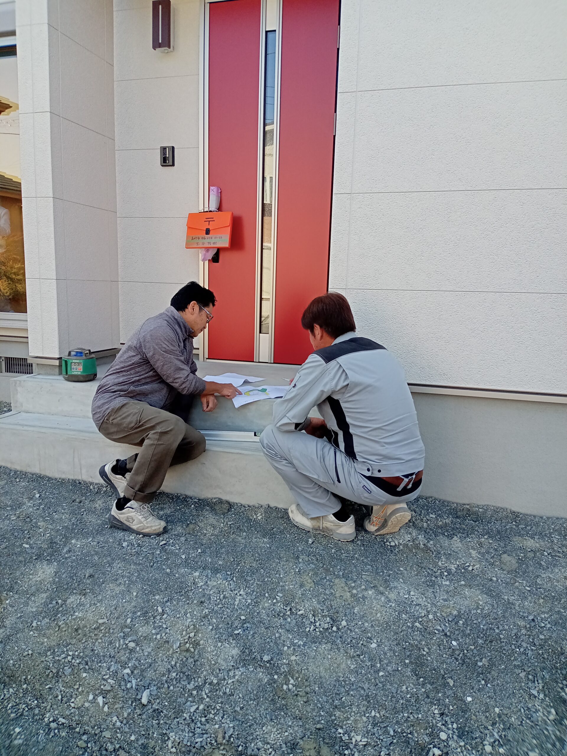 2026.01.08- 香木家だより建物が完成して外構工事の着手前打合せです。 図面をもとに最終確認を行いますが、現場にて業者さんと照合しながら寸法や仕上がりなどをチェックしていきます。 建物と同時に外構工事の完成を楽しみにして下さっているお客様の為に気を引き締めて打合せをしている松下社員でした。 -